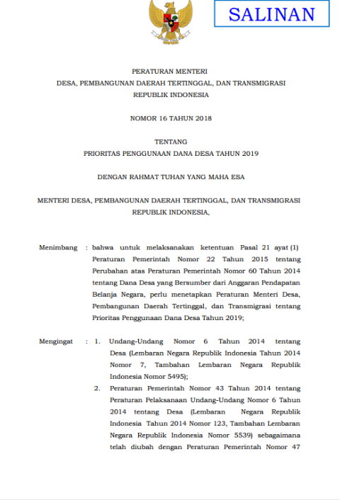 PermenDesa PDTT No 16 Tahun 2018 By Desa Selasari - 29-10-2018 0 62 Facebook WhatsApp Telegram LINE Download Version Download 5 File Size 113.09 KB File Count 1 Create Date 29-10-2018 Last Updated 29-10-2018 PermenDesa PDTT No 16 Tahun 2018