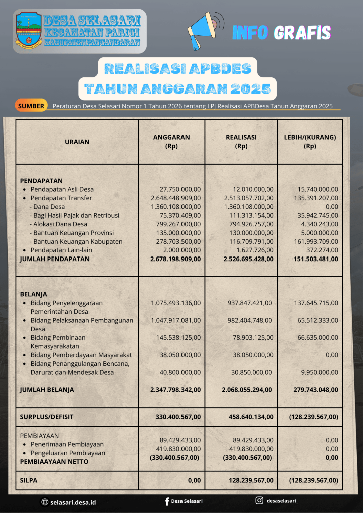 Pemerintah Desa Selasari secara resmi menyampaikan Realisasi Anggaran Pendapatan dan Belanja Desa (APBDes) Tahun Anggaran 2025 serta Anggaran Pendapatan dan Belanja Desa (APBDes) Tahun Anggaran 2026 kepada masyarakat. Informasi ini disampaikan sebagai bentuk komitmen pemerintah desa dalam mewujudkan transparansi dan akuntabilitas pengelolaan keuangan desa, khususnya yang bersumber dari Dana Desa.